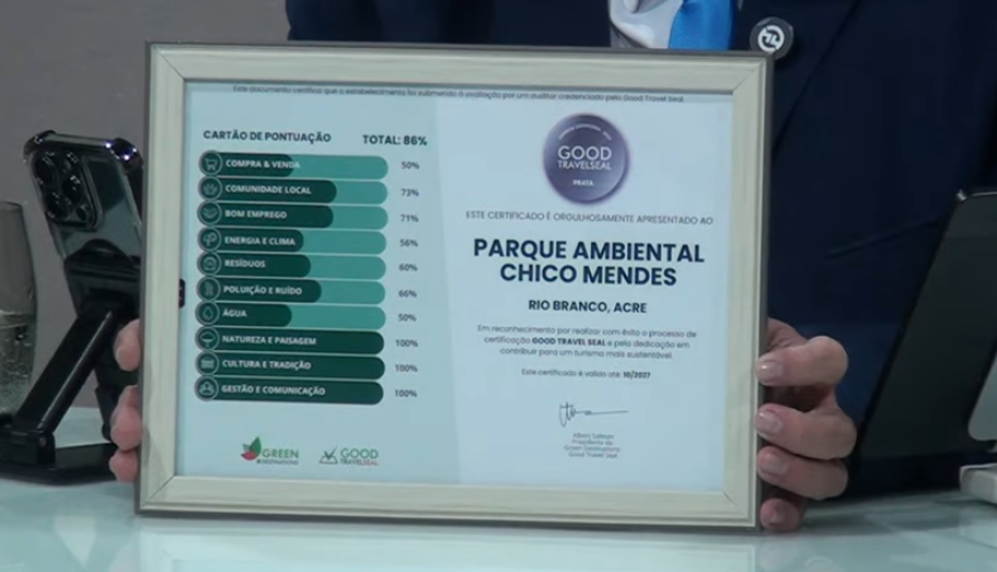 Parque Ambiental Chico Mendes: Reconhecimento Internacional. Outra vitória celebrada foi a conquista da medalha de prata para o Parque Ambiental Chico Mendes, que recebeu certificação de uma empresa alemã que avalia parques ambientais em todo o mundo. É a primeira vez que o parque é certificado, e ele se tornou o único parque municipal ambiental de zona urbana certificado no Brasil. O prefeito ressaltou a importância de Chico Mendes como figura mundialmente reconhecida na área ambiental, e a cidade busca agora a medalha de ouro.