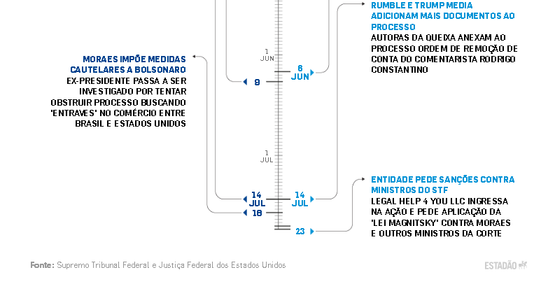 Na segunda-feira, 2 de junho, Moraes marcou os interrogatórios dos oito réus do “núcleo crucial” da tentativa de golpe para a segunda seguinte, dia 9. Na sexta-feira, 6, a Trump Media fez um aditamento no processo, apresentando novos argumentos contra Moraes.