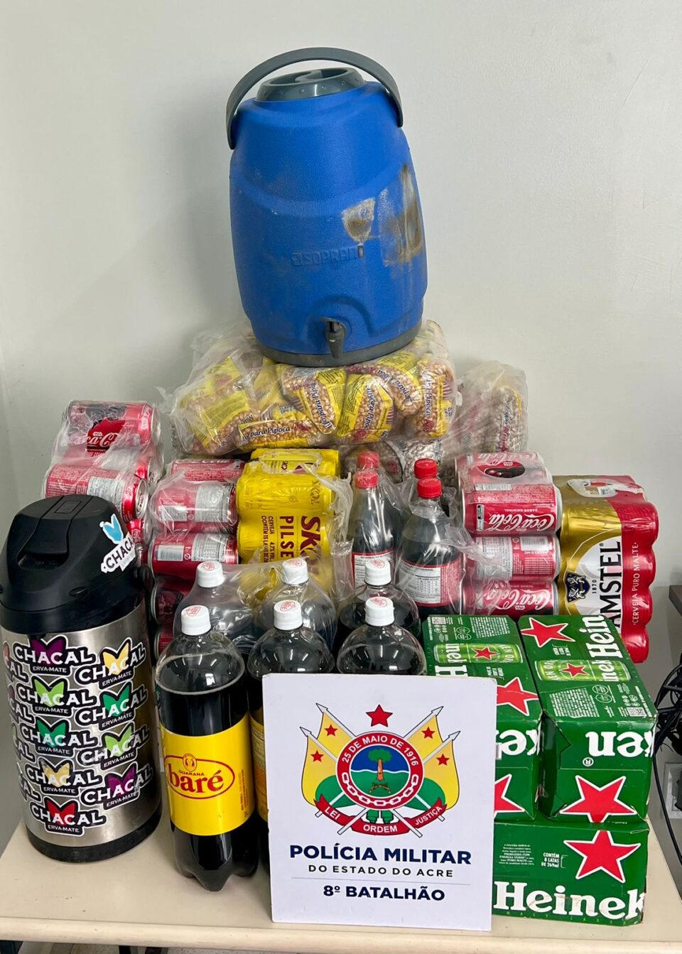 Durante as diligências, policiais do 8º Batalhão receberam informações de moradores sobre um homem visto transportando sacos com alimentos em direção a uma residência abandonada nas proximidades. No local indicado, o suspeito foi encontrado com diversos produtos furtados, incluindo alimentos, bebidas e utensílios.