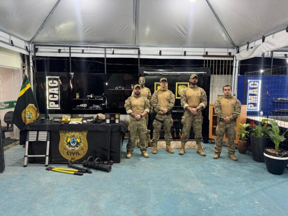A Polícia Civil do Acre (PCAC) marcou presença na primeira noite da Expoacre 50 anos, realizada no Parque de Exposições Wildy Viana, em Rio Branco, com uma exposição especial da Coordenadoria de Operações e Recursos Especiais (CORE), no estande da Secretaria de Justiça e Segurança Pública (Sejusp). A equipe da CORE apresentou ao público um pouco de sua rotina de trabalho, destacando a missão do grupo de elite da PCAC e exibindo os equipamentos utilizados em operações de alta complexidade.
