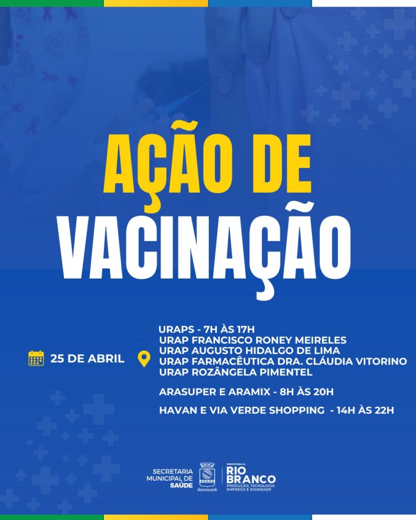 A Prefeitura de Rio Branco realiza, neste sábado (25), uma grande ação itinerante de imunização, com o objetivo de elevar a cobertura vacinal e facilitar a vida de quem não consegue buscar as unidades de saúde em dias úteis. Ao todo, 19 pontos estratégicos estarão distribuídos pela capital, funcionando com horários estendidos e em locais de grande circulação.