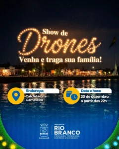 A Prefeitura de Rio Branco realiza neste sábado (20) um show de drones no Calçadão da Gameleira, como parte da programação especial de fim de ano na capital acreana. O espetáculo gratuito está marcado para começar às 22h e é voltado para públicos de todas as idades.
