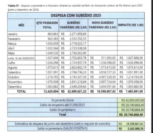 Segundo o projeto, que foi acessado pela reportagem do ac24horas, a medida terá impacto financeiro de R$ 7,48 milhões apenas entre junho e dezembro de 2025. Para os anos de 2026 e 2027, o custo projetado do subsídio é de R$ 12,42 milhões, valores que já estão previstos para inclusão na Lei Orçamentária Anual (LOA) de cada exercício.