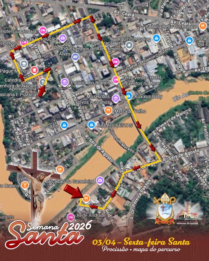 A Diocese de Rio Branco conduz, nesta Sexta-feira Santa (3), as principais atividades da Semana Santa 2026. O cronograma para o dia inclui ritos solenes, uma caminhada penitencial pelas ruas da capital e a representação artística do julgamento e morte de Jesus Cristo. Iniciado no dia 28 de março, o ciclo festivo cristão estende-se até o próximo domingo, 5 de abril.
