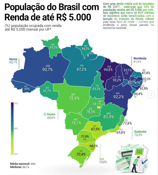 BRASÍLIA – Uma análise recente elaborada pelo Brasil Em Mapas©, com base na Pesquisa Nacional por Amostra de Domicílios Contínua (PNAD Contínua) de 2025, aponta que a proposta de isenção do Imposto de Renda (IR) para quem recebe até R$ 5 mil mensais teria um impacto significativo, beneficiando 84% da população brasileira ocupada. Em números absolutos, isso representa aproximadamente 85,9 milhões de brasileiros que seriam aliviados da carga tributária.
