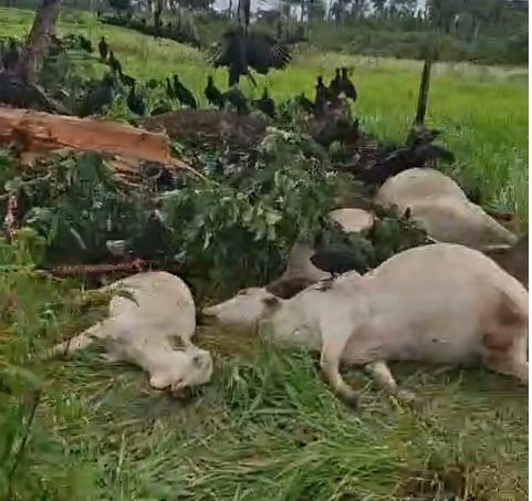 De acordo com testemunhas e registros compartilhados em redes sociais, o gado, composto por vacas e bezerros, buscou abrigo sob uma árvore isolada no pasto para se proteger de uma forte chuva. No momento da tempestade, o local foi atingido por um raio, causando a morte imediata dos animais que estavam agrupados sob a copa.