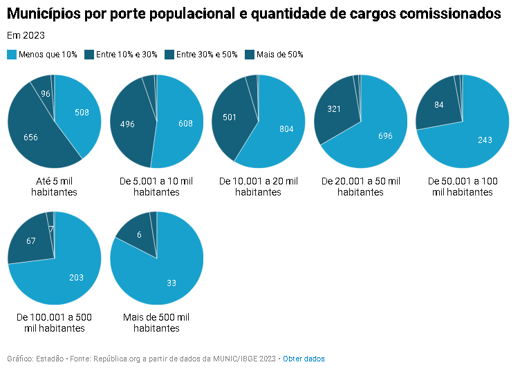 Essa quantidade é maior do que nas cidades com mais de 500 mil habitantes, onde só 18% das prefeituras empregam mais de 10% de cargos comissionados (são sete prefeituras entre 40 com esse porcentual).