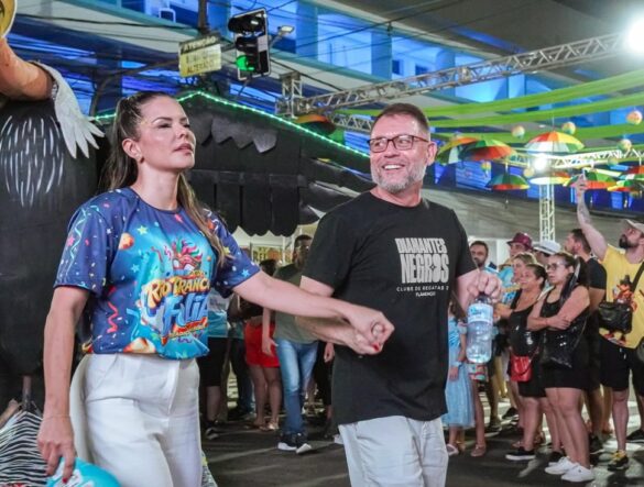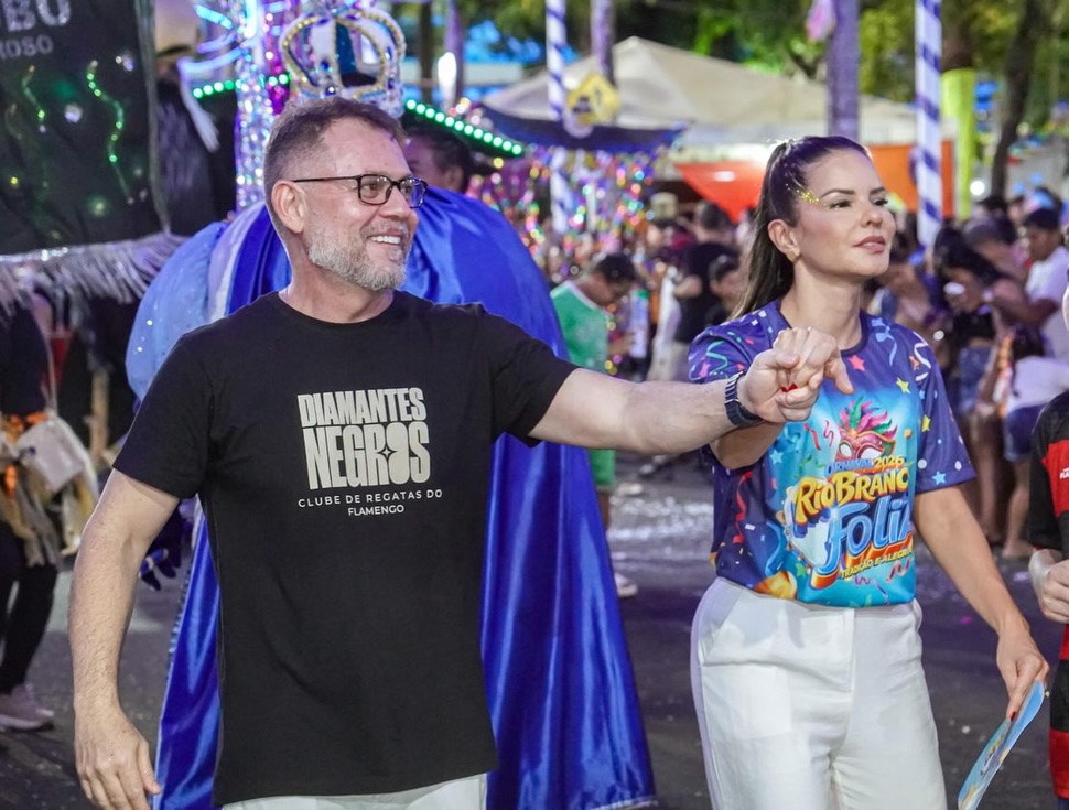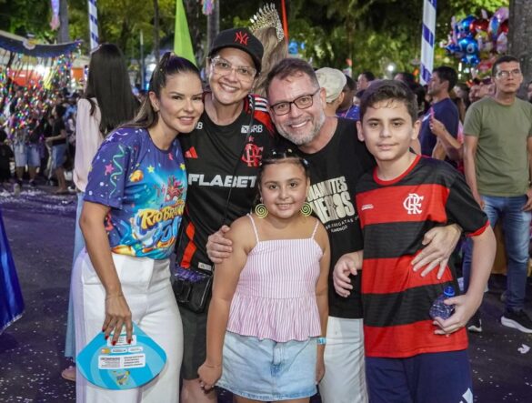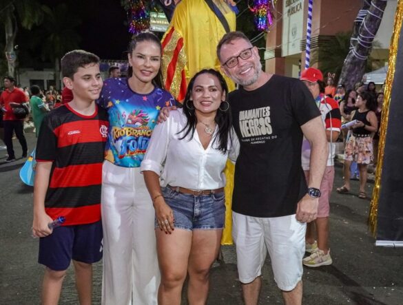 A terceira noite do Rio Branco Folia foi marcada por um clima de descontração e união familiar. O vice-prefeito de Rio Branco, Alysson Bestene, marcou presença no evento acompanhado de sua esposa, Roberta Souza Lins, e do filho, Miguel, reforçando o caráter festivo e seguro da celebração na capital acreana.