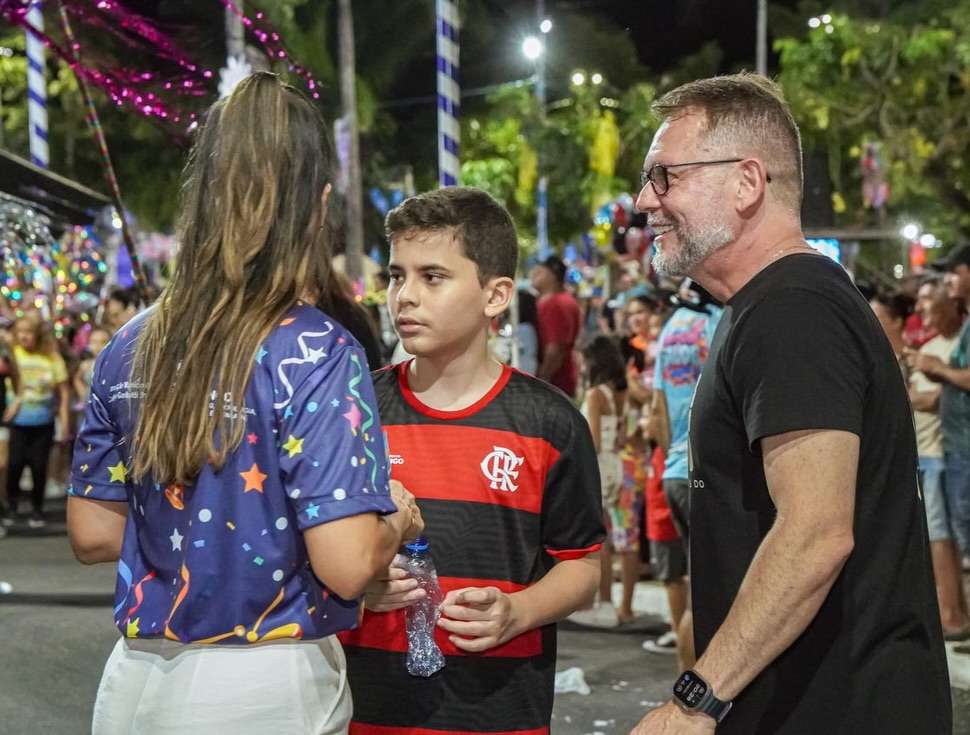 A terceira noite do Rio Branco Folia foi marcada por um clima de descontração e união familiar. O vice-prefeito de Rio Branco, Alysson Bestene, marcou presença no evento acompanhado de sua esposa, Roberta Souza Lins, e do filho, Miguel, reforçando o caráter festivo e seguro da celebração na capital acreana.