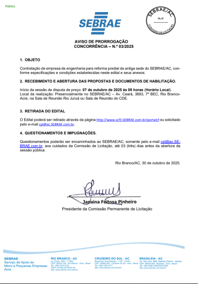 EditaisSEBRAE: AVISO DE PRORROGAÇÃO CONCORRÊNCIA – Nº 03/2025 Publicado em 30/10/2025 Aviso de Prorrogação da Concorrência Nº 03 2025 (1) Compartilhe: