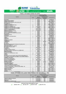 O Sistema Nacional de Emprego (Sine) do Acre divulgou, nesta quarta-feira (26), um novo painel com 165 vagas de trabalho disponíveis para diversas áreas profissionais em Rio Branco.