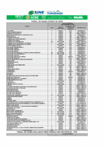 O Sistema Nacional de Emprego (Sine) do Acre divulgou, nesta terça-feira (2), um novo painel com 387 vagas de trabalho abertas em diversas áreas profissionais em Rio Branco.