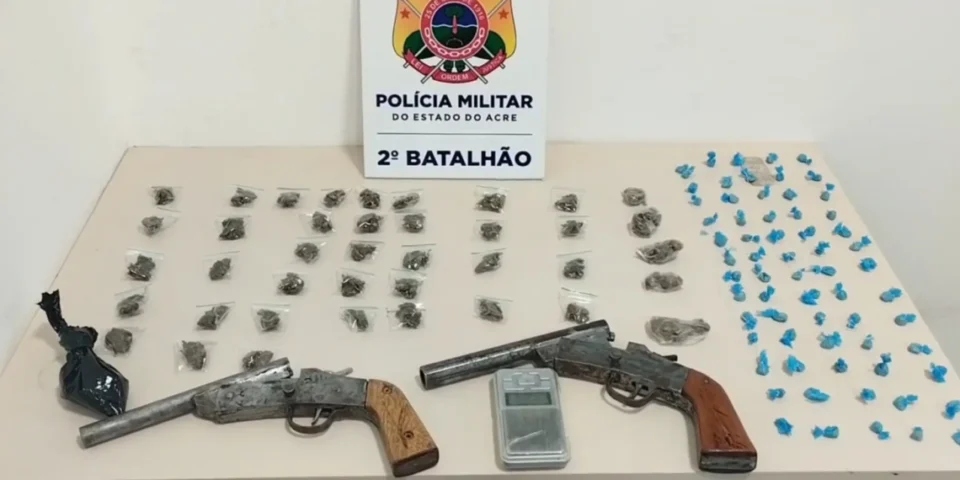 Na noite desta quinta-feira (31), uma patrulha da Polícia Militar apreendeu duas escopetas e porções de drogas em uma área de mata no bairro Triângulo, em Rio Branco. O material foi encontrado após a fuga de um homem que, ao avistar a aproximação da viatura, entrou rapidamente em uma trilha de vegetação densa.