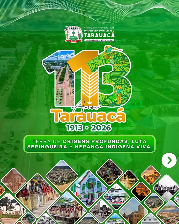 O município de Tarauacá completa 113 anos de emancipação política nesta sexta-feira (24). Para celebrar a data, a Prefeitura Municipal preparou uma agenda especial que se estende até domingo (26), unindo atos cívicos, entregas institucionais, competições esportivas e celebrações religiosas sob o tema: “Terra de origens profundas, luta seringueira e herança indígena viva”.