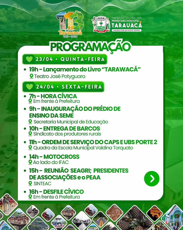 Em nota, a gestão municipal reforçou que o aniversário é um momento de união. “A programação foi organizada para valorizar nossa história e o povo de Tarauacá. Convidamos todos a celebrar as conquistas e os avanços deste novo tempo”, destaca o comunicado oficial.