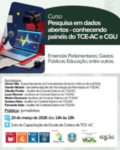 No próximo dia 20 de março de 2026, o Tribunal de Contas do Estado do Acre (TCE-AC) e a Controladoria-Geral da União (CGU) realizam a capacitação “Pesquisa em dados abertos – conhecendo painéis do TCE-AC e CGU”. O curso é voltado para profissionais da imprensa e acontece das 14h às 18h, na Sala de Capacitação da Escola de Contas do TCE-AC.