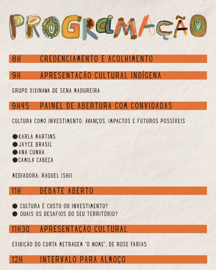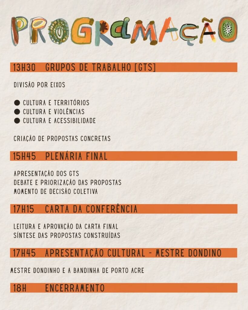 As resoluções desses debates serão compiladas na “Carta da Conferência”, documento que servirá como guia para reivindicações políticas e ações do setor cultural junto ao poder público.