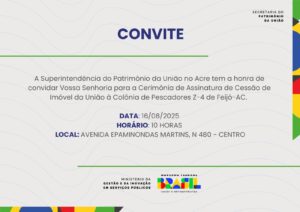 A Superintendência do Patrimônio da União no Acre (SPU/AC) realiza, neste sábado, 16 de agosto de 2025, às 10 horas, a cerimônia de assinatura do contrato de cessão de um imóvel da União para a Colônia de Pescadores e Aquicultores de Feijó (COLPAF). O ato será realizado no endereço do próprio imóvel, localizado na Avenida Epaminondas Martins, nº 480, no centro do município.
