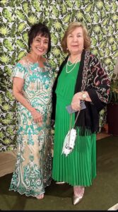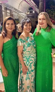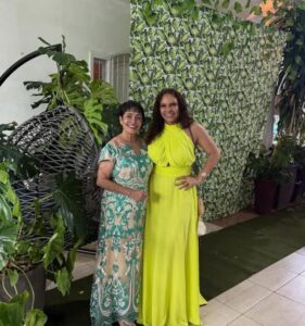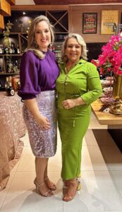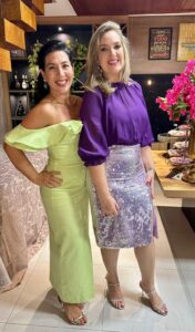 Na foto, Dra. Simone, deslumbrante em um vestido verde todo bordado, ao lado da amiga Flavia Lavocat.