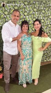 Simone Chaves ladeada pelo elegante casal Inácio e Marina Gontijo.